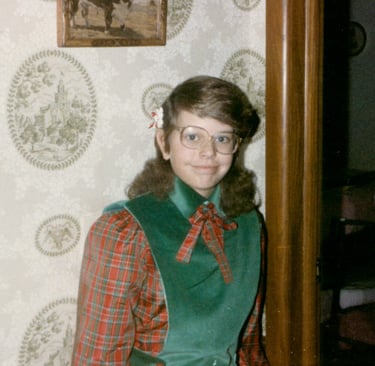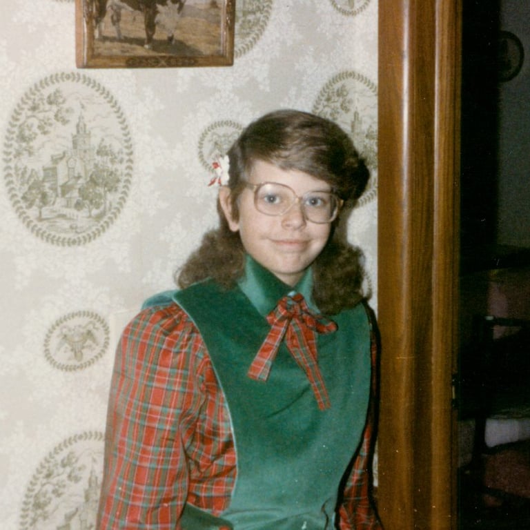 In mid-December (late 80s), the green-vested “Christmas dress” arrived. As I opened the box, Mom exclaimed, “Oh WOW!” My eyes widened in dread…Oh no. Pre-teen and self-conscious, I disliked how I looked, yet I remained beholden to Mom’s fashion sense in hairstyle and clothing. Sunday rolled around, and I and my velvet vest dress (with perm-mullet hair sprayed into place) dutifully headed to church. Mom insisted I looked cute. My crooked glasses only further cemented into my mind that I held the title of biggest dork in the sanctuary.